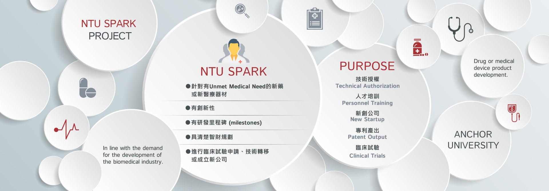 針對欲投入藥物或醫療器材產品開發,或已有研發成果但缺乏商品化概念之研究人員,施予產品開發鏈上包括轉譯、醫療法規、智財與談判、行銷與商業規劃等必要的訓練課程,將此類發展生技人才軟實力的培養課程由學研界開始紮根與培育。