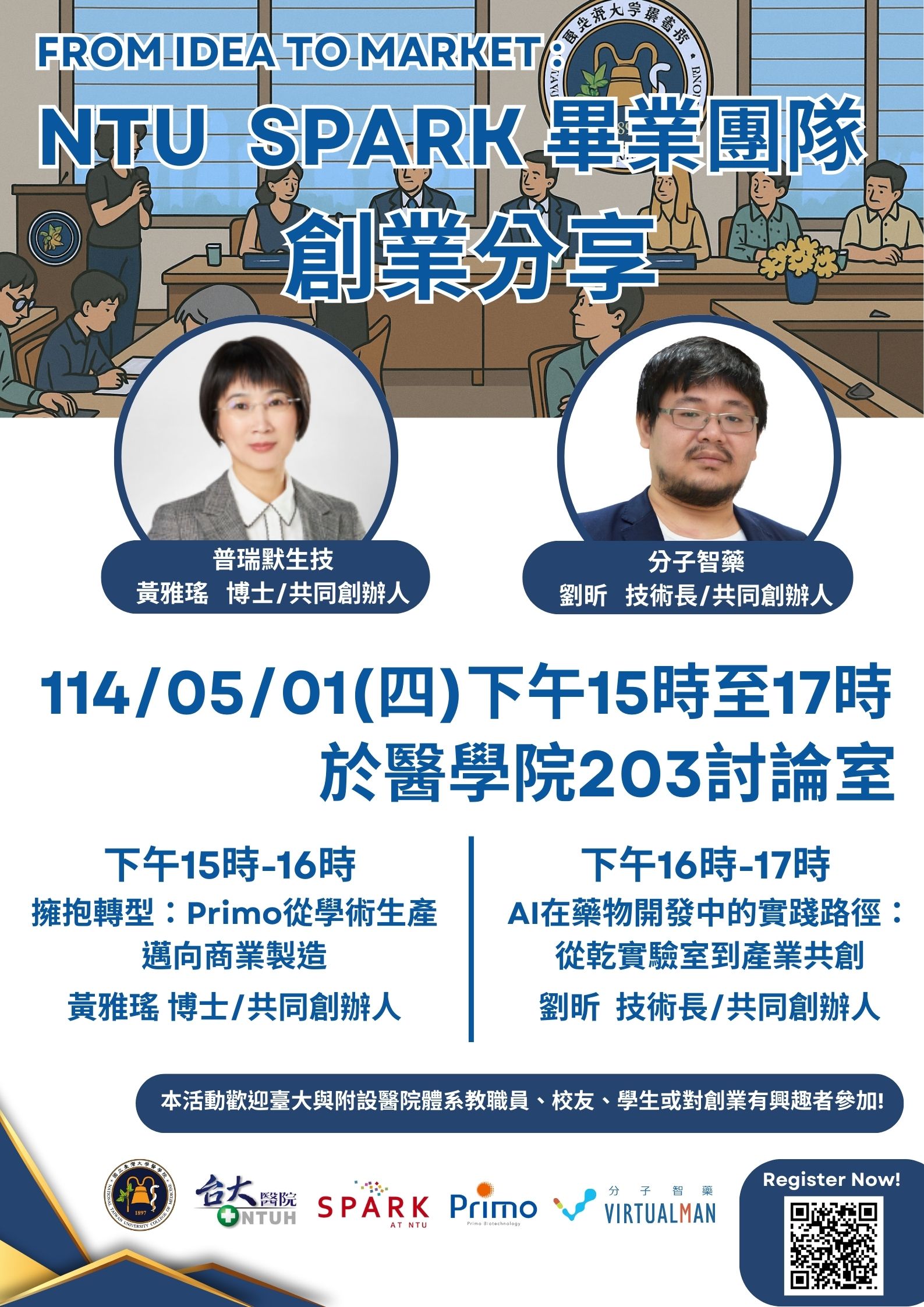 5/1 (四)PM 3:00-4:00 普瑞默生技公司 黃雅瑤共同創辦人/博士 擁抱轉型:Primo從學術生產邁向商業製造 5/1 (四)PM 4:00-5:00 分子智藥公司 劉昕共同創辦人/技術長 AI在藥物開發中的實踐路徑:從乾實驗室到產業共創